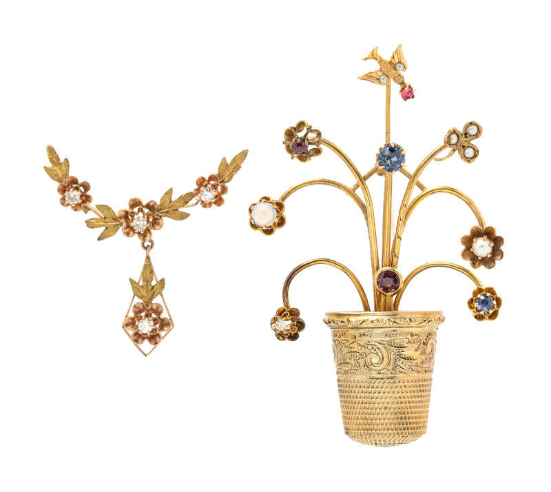 consisting of an articulated rose and yellow gold brooch containing five old European cut diamonds weighing approximately 0.25 carat total, together with a brooch composed of nine stick pins containing various gems and pearls set within a gold thimble base.