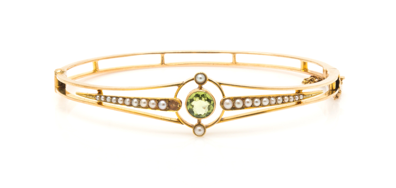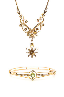 consisting of a bangle containing one round mixed cut peridot measuring approximately 6.00 mm in diameter and 24 round white cultured seed pearls measuring approximately 1.00-2.15 mm and a necklace containing a floral motif pendant with numerous cultured seed pearls and two rope chain sections.Necklace Stamp: Karat stamp obscured / various scratch marks.