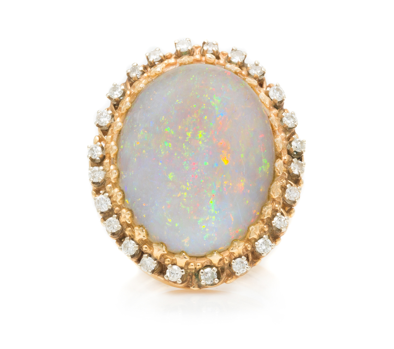 containing one oval cabochon cut opal measuring approximately 22.70 x 17.90 x 5.80 mm and 24 round brilliant cut diamonds weighing approximately 0.48 carat total.