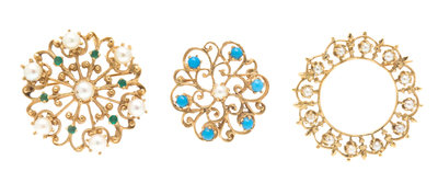 consisting of a brooch containing six round mixed cut emeralds weighing approximately 0.42 carat total and seven round white cultured pearls measuring approximately 5.20 mm each, a brooch containing 12 round white cultured pearls measuring approximately 2.90 mm each and a brooch containing six round cabochon cut turquoise measuring approximately 3.50 mm each and one white round cultured pearl measuring approximately 4.25 mm.
