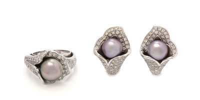 consisting of a ring containing one pearl measuring approximately 9.09 mm in diameter and numerous pave set round brilliant cut diamonds weighing approximately 0.53 carat total, together with a pair of matching earclips containing two pearls measuring approximately 8.30 mm in diameter and numerous pave set round brilliant cut diamonds weighing approximately 0.78 carat total.Stamp: CB 750.
