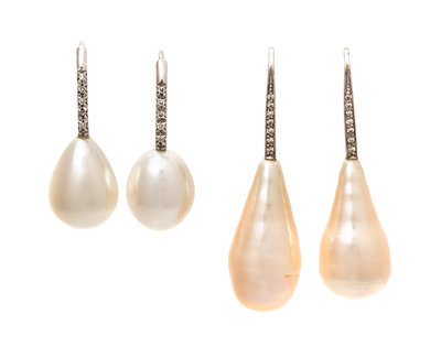 consisting of one pair of earrings containing two drop pearls measuring approximately 14.40 x 10.80 mm and 10 round brilliant cut diamonds weighing approximately 0.05 carat total together with a pair of earrings containing two baroque pearls measuring approximately 23.20 x 11.25 mm and 14 round brilliant cut diamonds weighing approximately 0.07 carat total weight.