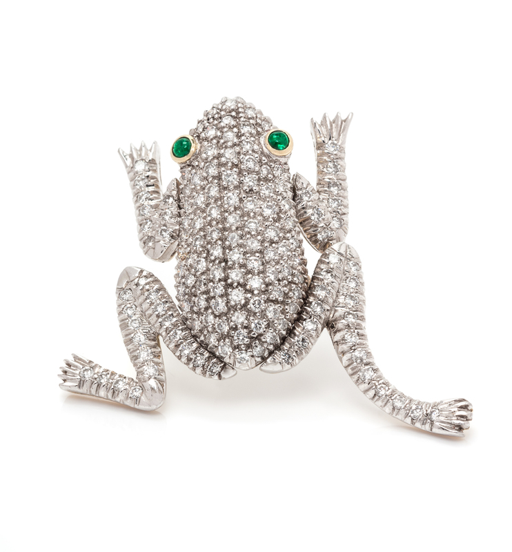 An 18 Karat Bicolor Gold, Diamond and Emerald Articulated Frog Brooch,