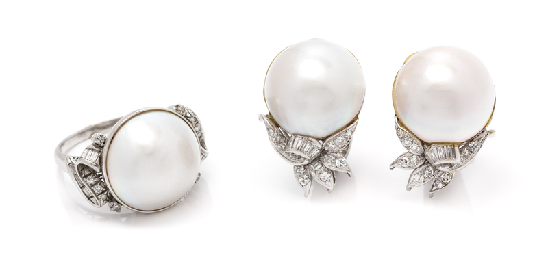 A Platinum, White Gold, Mabe Pearl and Diamond Demi Parure, Circa 1950,