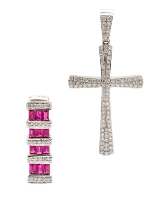 consisting of a pendant containing 12 baguette cut rubies measuring approximately 3.25 x 2.00 mm and 25 round brilliant cut diamonds weighing approximately 0.18 carat total together with a cross pendant containing 92 round brilliant cut diamonds measuring approximately 0.89 carat total.Stamp: 14K R (maker's mark).Stamp: G14K UAS.