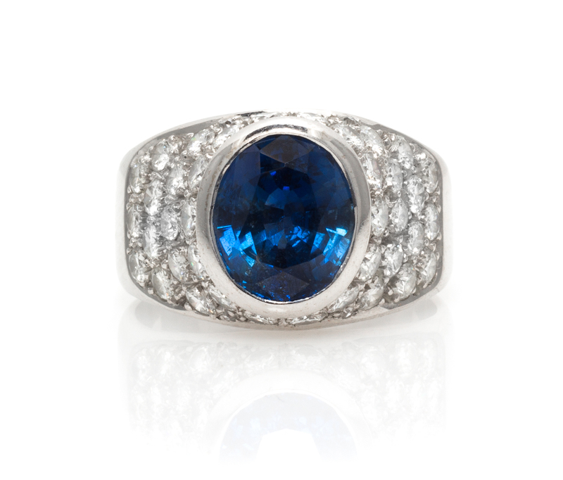 containing one oval mixed cut sapphire weighing approximately 3.47 carats and 38 round brilliant cut diamonds weighing approximately 1.52 carats total. Stamp: 18K.