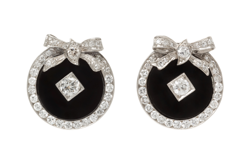 A Pair of Platinum, Diamond and Onyx Earclips,