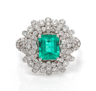 containing one octagonal step cut emerald weighing approximately 1.92 carats and 102 round brilliant cut diamonds weighing 1.55 carats total. Stamp: G750 d1.55ct.