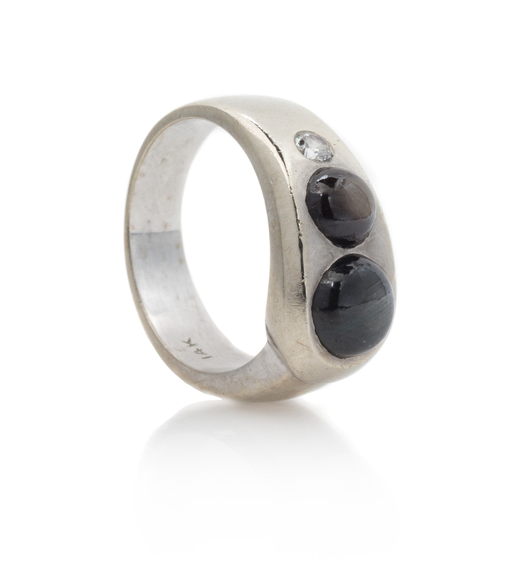 containing two round cabochon cut star sapphires measuring approximately 5.60-6.80 mm in diameter and one round brilliant cut diamond weighing approximately 0.08 carat.Stamp: 14K.