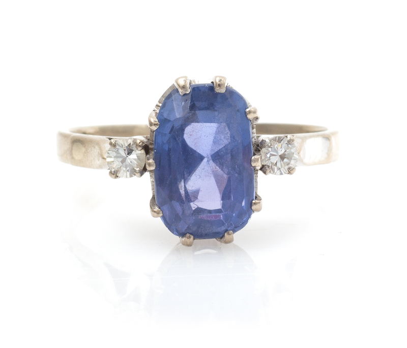containing one oval mixed cut sapphire weighing approximately 2.79 carats and two round brilliant cut diamonds weighing approximately 0.10 carat total.