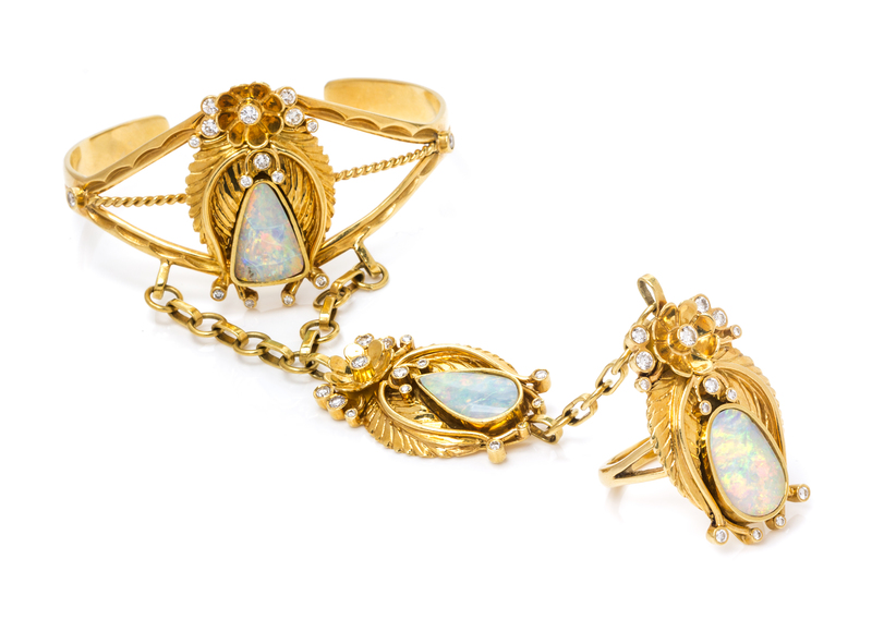 An 18 Karat Yellow Gold, Opal and Diamond Bracelet with Ring Attached,