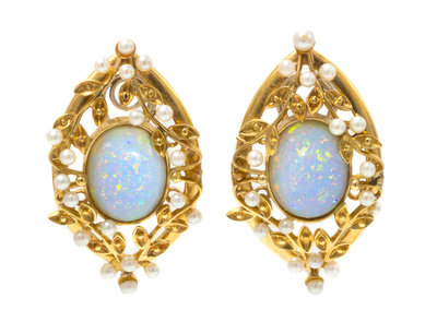 A Pair of 18 Karat Yellow Gold, Opal and Seed Pearl Foliate Motif Earclips,