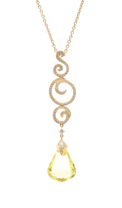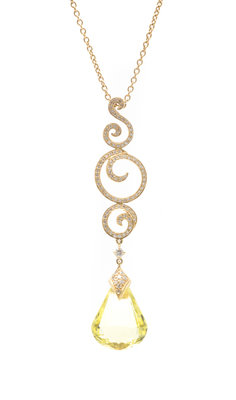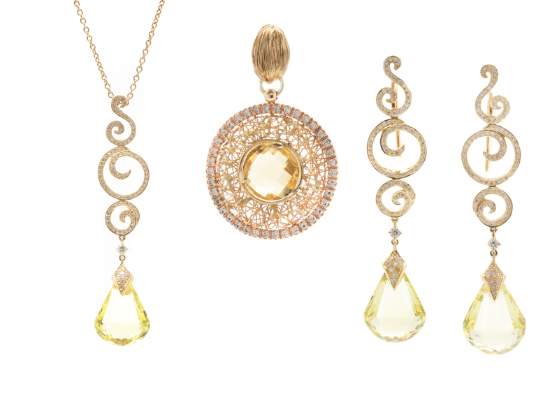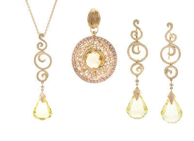 consisting of a pendant containing a modified briolette cut yellow quartz measuring approximately 13.05 x 16.30 x 8.50 mm and 101 round brilliant cut diamonds weighing approximately 0.32 carat total, suspended from an 18 karat yellow gold chain, together with a matching pair of earrings containing two modified briolette cut yellow quartz measuring approximately 13.05 x 16.30 x 8.50 mm and 202 round brilliant cut diamonds weighing approximately 0.64 carat total. Together with a double cabochon checkerboard cut citrine measuring approximately 11.90 mm in diameter set into an intricate yellow gold wire work center and 38 round brilliant cut diamonds weighing approximately 0.57 carat total set into a rose gold border.Stamp: 750 CBStamp: 750 CB.