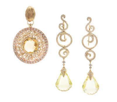 An 18 Karat Yellow Gold, Yellow Quartz and Diamond Demi Parure, Together With A Bicolor Gold, Citrine, and Diamond Pendant,