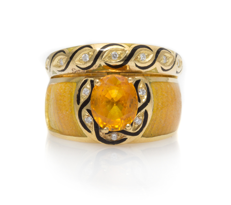 An 18 Karat Yellow Gold, Yellow Sapphire, Diamond and Polychrome Enamel Ring,
