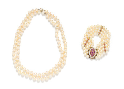 consisting of a multistrand bracelet containing 100 pearls measuring approximately 5.00-5.90 mm in diameter strung knotted with three spacer bars and a 14 karat yellow gold clasp containing 24 round mixed cut rubies weighing approximately 2.49 carats total and 22 seed pearls, together with a convertible pearl necklace containing 95 pearls measuring approximately 6.68-7.84 mm in diameter.Stamp: 14k.