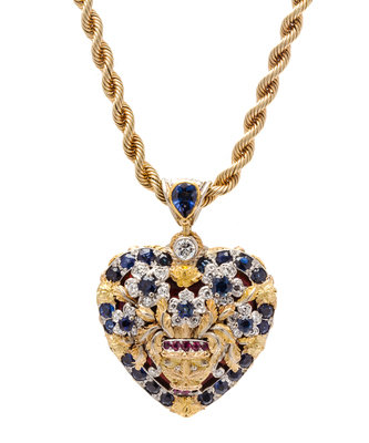 An 18 Karat Yellow Gold, Sapphire, Ruby, Diamond and Enamel Heart Motif Pendant,