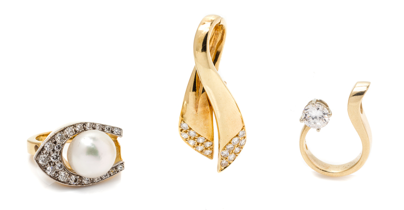 consisting of a ring containing 20 round brilliant cut diamonds weighing approximately 0.70 carat total and one cultured pearl measuring approximately 11.20 mm in diameter, a pendant containing one cubic zirconia measuring approximately 5.60 mm in diameter, together with a pendant containing 16 round brilliant cut diamonds weighing approximately 0.48 carat total.Pendant stamp: 14k.