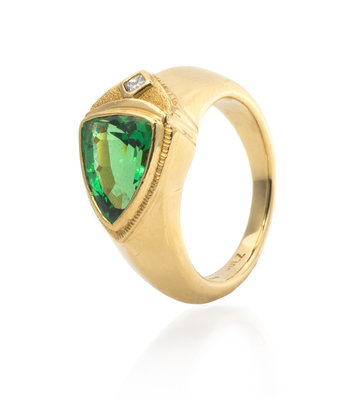 containing one triangular brilliant cut tsavorite weighing approximately 2.50 carats and one princess cut diamond weighing approximately 0.04 carat in a textured and polished asymmetric setting.Stamp: 18K (partially obscured) BOLZ.