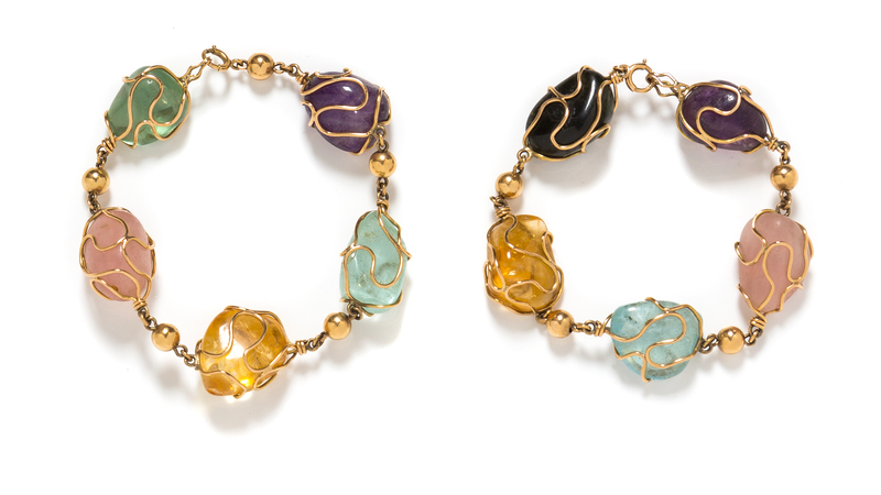 consisting of two bracelets containing two tumbled amethyst, rose quartz, aquamarine, citrine and green tourmaline beads within wirework frames.Stamp: 14K.