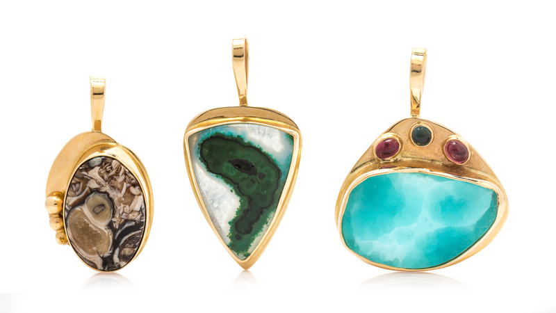consisting of a pendant containing one oval cabochon cut druzy agate, a pendant containing one shield shape buff top hardstone, together with a pendant containing one ovoid hardstone, two oval cabochon cut pink tourmaline and one oval cabochon cut green tourmaline.Stamp: THC 14K.