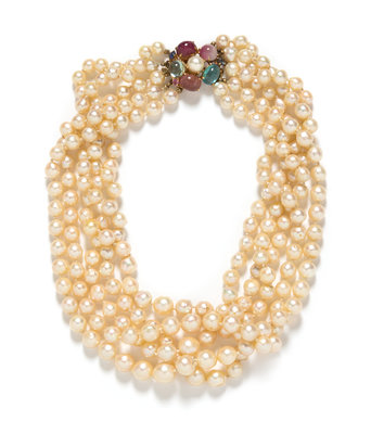 consisting of five strands of semi-baroque pearls measuring approximately 6.87-10.20 mm in diameter strung knotted with a 14 karat yellow gold clasp containing three oval and round cabochon cut pink tourmaline, one oval cabochon cut blue tourmaline, one round cabochon cut aquamarine, two round cabochon cut sapphires and one round mixed cut pink sapphire.Stamp: 14K.