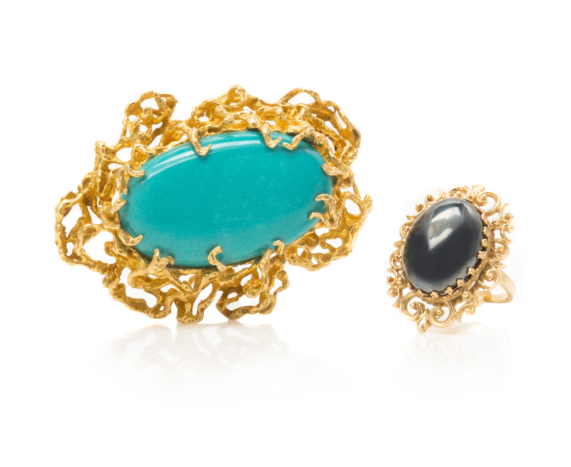 consisting of a ring containing one oval cabochon cut hematite weighing approximately 25.80 carats together with a brooch containing one oval cabochon cut composite imitation turquoise within an intricate textured openwork setting.Stamp: 14K.Stamp: 14K.