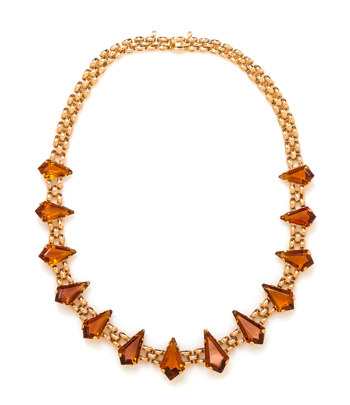 containing 13 kite shape step cut citrine measuring from approximately 16.00 x 9.30 mm up to 20.70 x 11.00 mm set at regular intervals in the front half of the panther link chain.Stamp: 18.