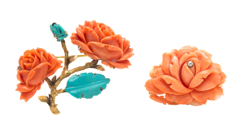 A Collection of Two 14 Karat Yellow Gold and Coral Brooches,
