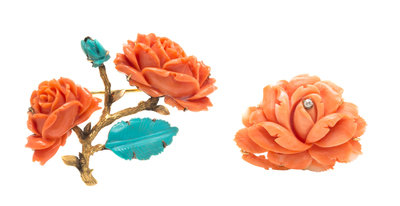 consisting of a brooch containing one carved coral and one round brilliant cut diamond weighing approximately 0.08 carat total, together with a brooch containing two coral floral motif carvings measuring approximately 37.00 x 20.00 mm and 31.00 x 16.00 mm together with a turquoise leave and floral carving measuring approximately 11.00 x 17.70 and 27.00 x 15.75 mm. Stamp: 14K.Stamp: 14K.