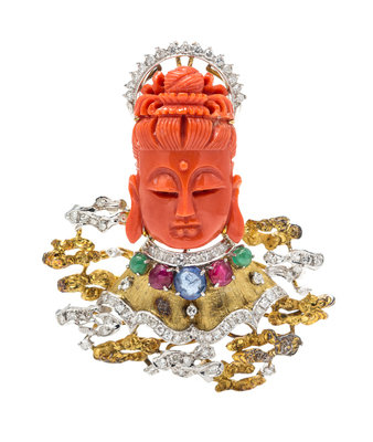 consisting of a carved orange coral head wearing a halo and collar and floating over a cloud motif base, containing one round cabochon cut sapphire measuring approximately 5.45 mm in diameter, two round cabochon cut rubies measuring approximately 4.20 mm in diameter, two round cabochon cut emeralds measuring approximately 3.40 mm in diameter and 68 round single cut diamonds weighing approximately 1.66 carats total. Stamp: 14K CECIL.