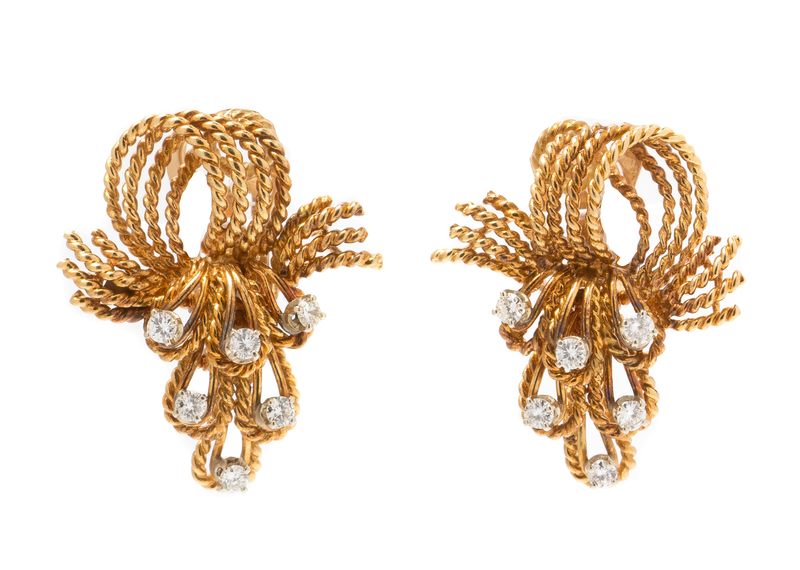 A Pair of 18 Karat Yellow Gold and Diamond Articulated Earclips, Circa 1960,