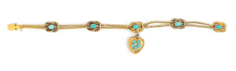 consisting of five knot motif meshwork chain sections surmounted with oval cabochon cut turquoise and joined with a double row meshwork chain, suspending an intricately textured heart shape pendant containing five round cabochon cut turquoise, the reverse with glazed compartment and woven hair.