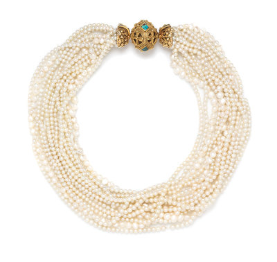A Yellow Gold, Turquoise and Cultured Pearl Multistrand Torsade Necklace,