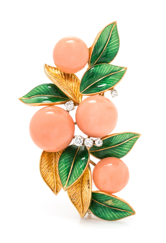 An 18 Karat Yellow Gold, Coral, Diamond and Enamel Foliate Motif Brooch, Italy,