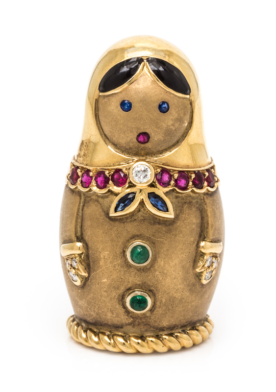 An 18 Karat Yellow Gold, Ruby, Emerald, Diamond, Sapphire and Enamel Matryoshka Doll Motif Brooch, Fred,