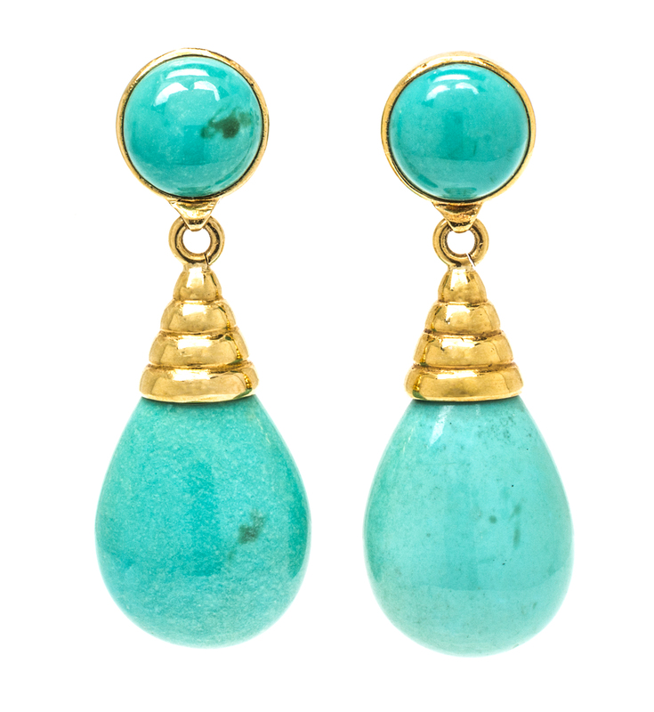 containing two round cabochon cut turquoise measuring approximately 8.00 mm in diameter and two turquoise drop pendants.Stamp: 750.