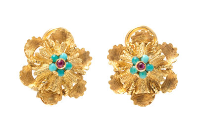 A Pair of 18 Karat Yellow Gold, Turquoise and Ruby Flower Motif Earclips,
