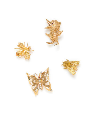 14 karat butterfly brooch signed DANFRERE containing 7 round brilliant cut diamonds and two single cut rubies, a 14 karat fly brooch, a 14 karat insect brooch containing two citrines, together with a duck brooch.