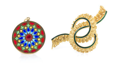 consisting of an 18 karat yellow gold textured knot motif brooch with green translucent enamel accents together with a yellow gold stained glass window motif pendant with various hues and gradations of enamel including green, red, yellow and blue, pendant measures approximately 26.00 mm in diameter.Brooch stamp: K18.