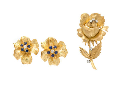 consisting of a pair of earrings with 10 round mixed cut sapphires weighing approximately 1.00 carat total and two round brilliant cut diamonds weighing approximately 0.18 carat total, together with an Italian brooch in a realistic sculpted rose design, containing five round single cut diamonds weighing approximately 0.27 carat total.Stamp: 18K DES. IN ITALY. Stamp: 18K.