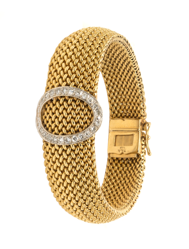 the hinged cover containing numerous round single cut diamonds, matte champagne dial signed EBEl, Arabic numerals, pencils hands, snap on case back, manual wind 17 jewel movement signed Jean Claude Watch Co, integrated woven mesh link bracelet, hidden clasp.Stamp: 14K.