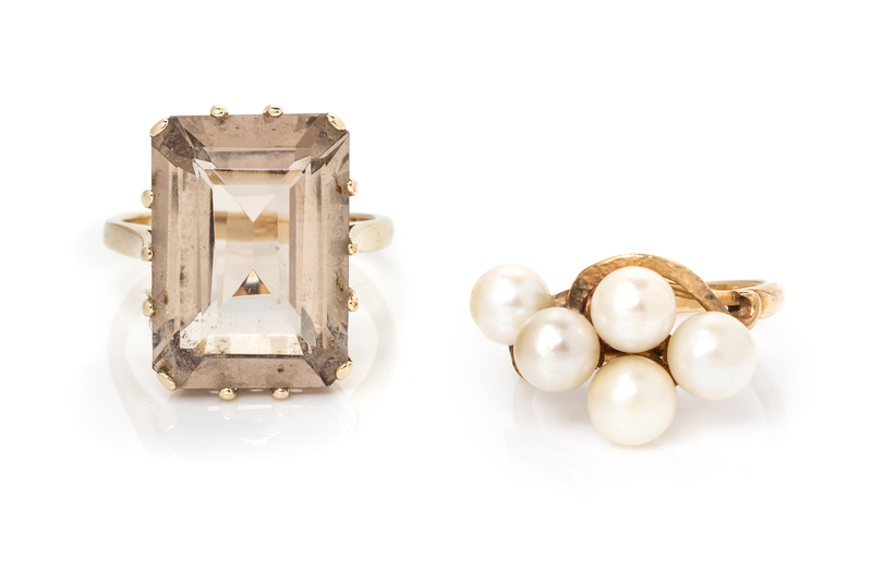 consisting of a ring containing one octagonal step cut smokey quartz measuring approximately 18.19 x 13.14 mm and a ring containing five cultured pearls measuring approximately 5.90 mm in diameter.Stamp: 14K, 14K MING'S.