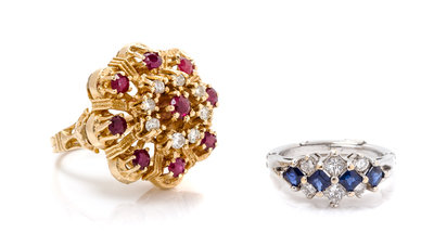 consisting of a yellow gold ring containing eight round brilliant cut diamonds weighing approximately 0.32 carat total and nine round mixed cut rubies weighing approximately 1.24 carat total, together with a 14 karat white gold ring containing four round brilliant cut diamonds weighing approximately 0.22 carat total, two princess cut diamonds weighing approximately 0.22 carat total and four princess cut sapphires weighing approximately 0.60 carat total.Stamp: 14K.