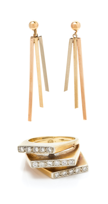consisting of an 18 karat yellow gold ring containing 16 round brilliant cut diamonds weighing approximately 0.43 carat total together with a pair of 14 karat tricolor screwbacks stick style earrings.Stamp: 18K FPS.Stamp: 14K.