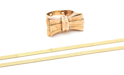 consisting of a herringbone link chain necklace measuring approximately 3.00 wide together with a rose gold bow motif ring.Stamp: 14Kt ITALY MIRROR-FLEX Aurafin.Stamp: 14K.