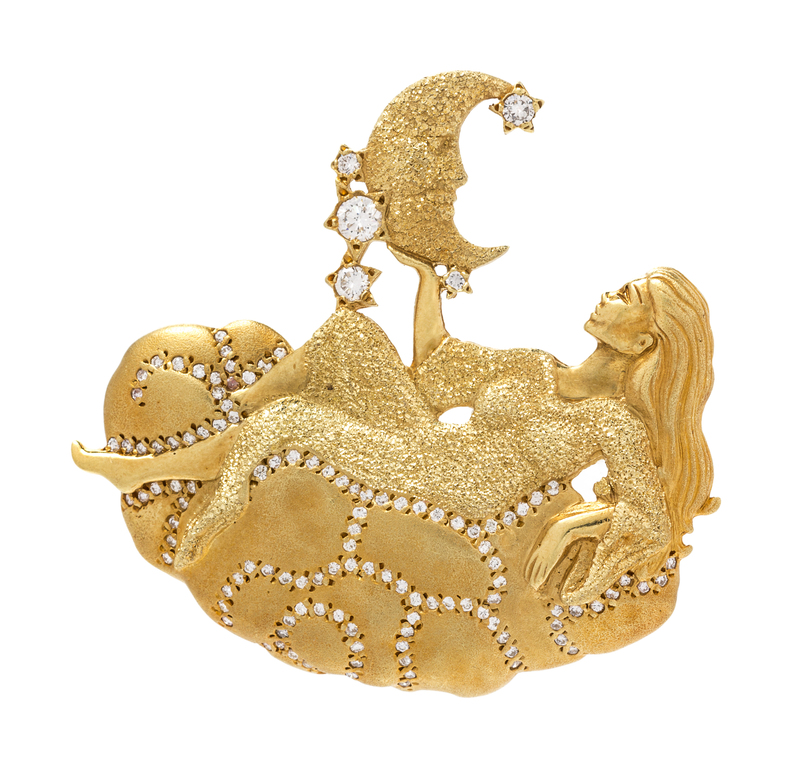 An 18 Karat Yellow Gold and Diamond Goddess and Moon Pendant/Brooch,