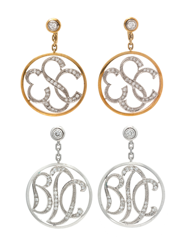 A Collection of 18 Karat Gold and Diamond Monogram Earrings,