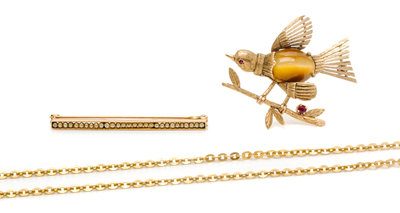 comprising of a 10 karat yellow gold bar brooch containing numerous seed pearls, a yellow gold bird brooch containing one oval cabochon cut tiger's eye and two round mixed cut rubies, together with an 18 karat yellow gold cable link chain.Stamp: 10K.Stamp: 750.
