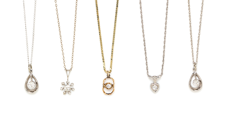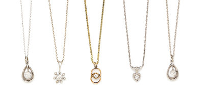 consisting of a yellow gold figure eight shaped pendant containing one round brilliant cut diamond weighing approximately 0.10 carat suspended from a 14 karat gold serpentine link chain, a white gold teardrop shape pendant containing one round brilliant cut diamond weighing approximately 0.20 carat suspended from a 14 karat white gold rope chain, a white gold teardrop shape pendant containing one round brilliant cut diamond weighing approximately 0.20 carat suspended from cable link chain, an 18 karat white gold heart shape pendant containing one round brilliant cut diamond weighing approximately 0.14 carat suspended from a 14 karat white gold chain, together with a white gold snowflake shape pendant set with eight round brilliant cut diamond weighing approximately 0.43 carat total suspended from 14 karat white gold cable link chain.